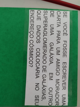 Querido amigo que mora tão distante, em outro Superaglomerado de Galáxias, aqui quem lhe escreve é a Terráquea Clara Takata Stolf, tenho 9 anos e estudo na Escola Municipal Pilarzinho. Segue abaixo meu endereço cósmico para que você possa se comunicar comigo.