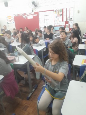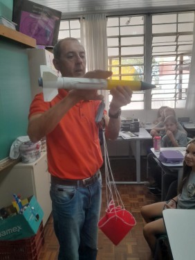 Ontem dia 26 de Novembro recebemos o cientista Carlos Marchi na escola. Ele foi até a nossa sala de aula e conversou com os dois 4° anos, explicou como os foguetes eram lançados e também nos mostrou maquetes de foguetes. Após as explicações nós fomos para a quadra de areia lançar mini foguetes. foi uma experiência muito legal.