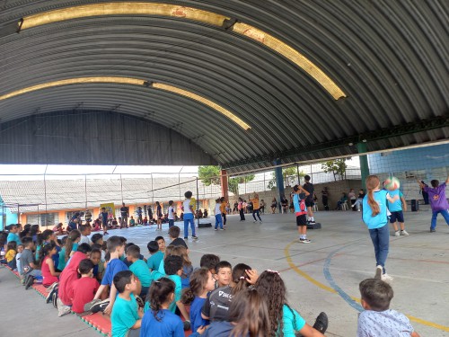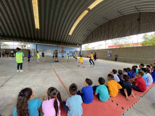 Hoje à tarde (26/11/25) aconteceu o torneio de vôlei na nossa escola e eu gostei muito de assistir. No início, o professor separou os jogadores para cada partida, e as crianças ficaram sentadas torcendo bastante. Quando a partida começou, os jogadores entraram em quadra e os professores de Educação Física ficaram anotando os pontos.
